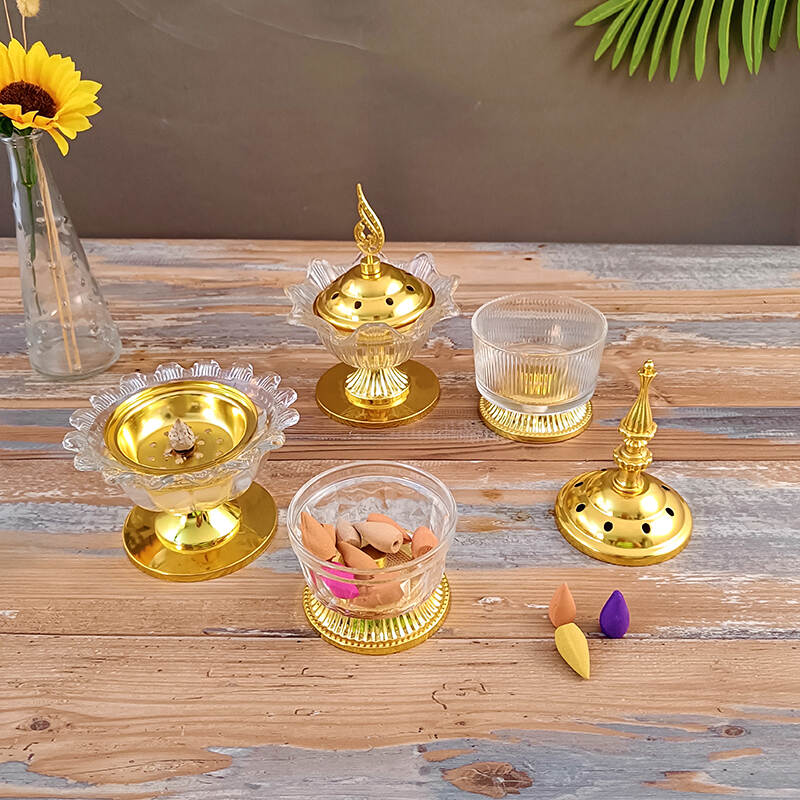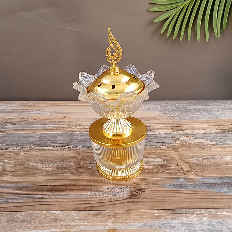 These incense burners are often made of a combination of metal (such as gold-plated materials) and glass. They have a gorgeous and exquisite appearance, with delicate patterns and unique top decorations (such as flames, crescents, etc.). They are mainly used to burn incense and often appear in scenes related to Arab culture.