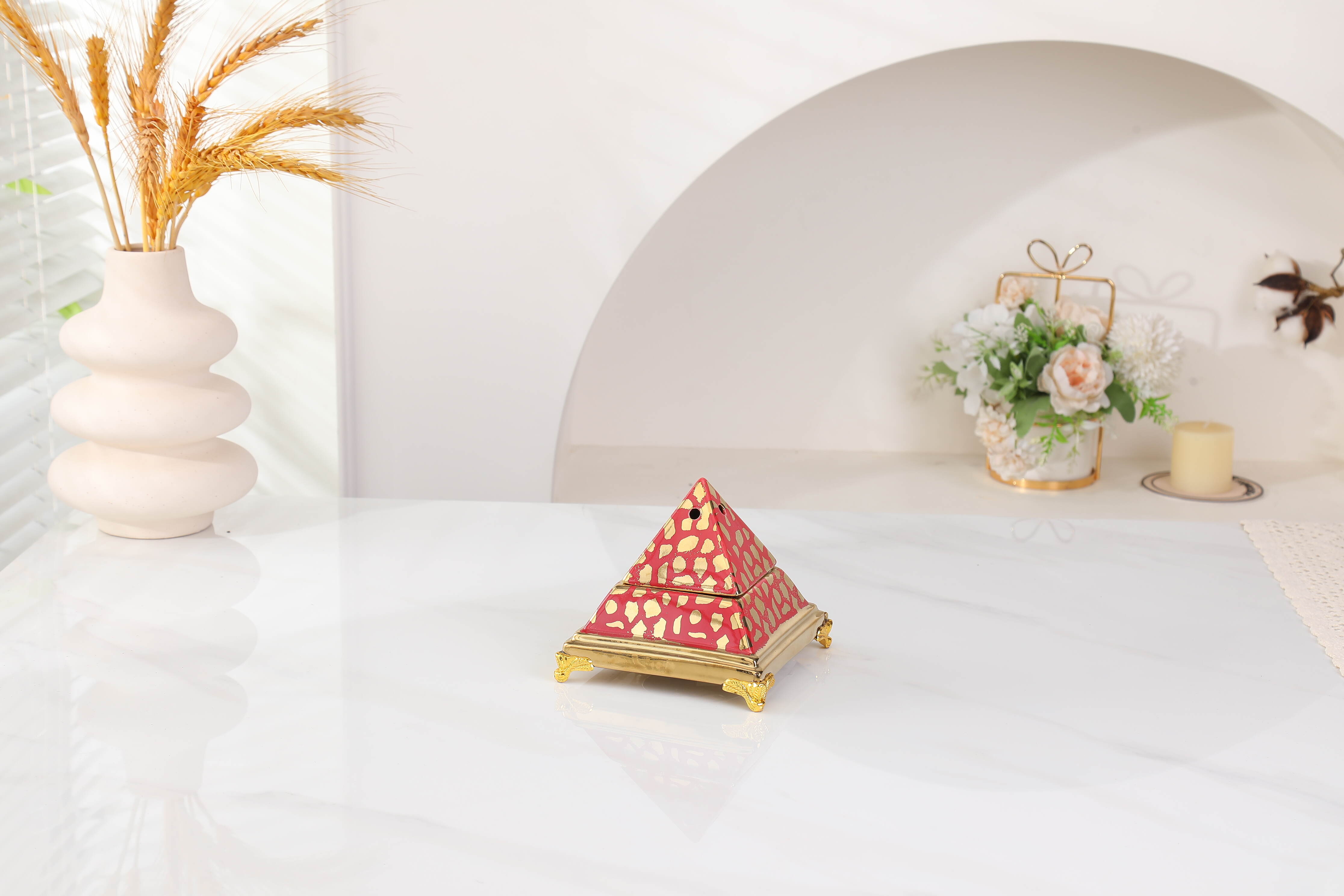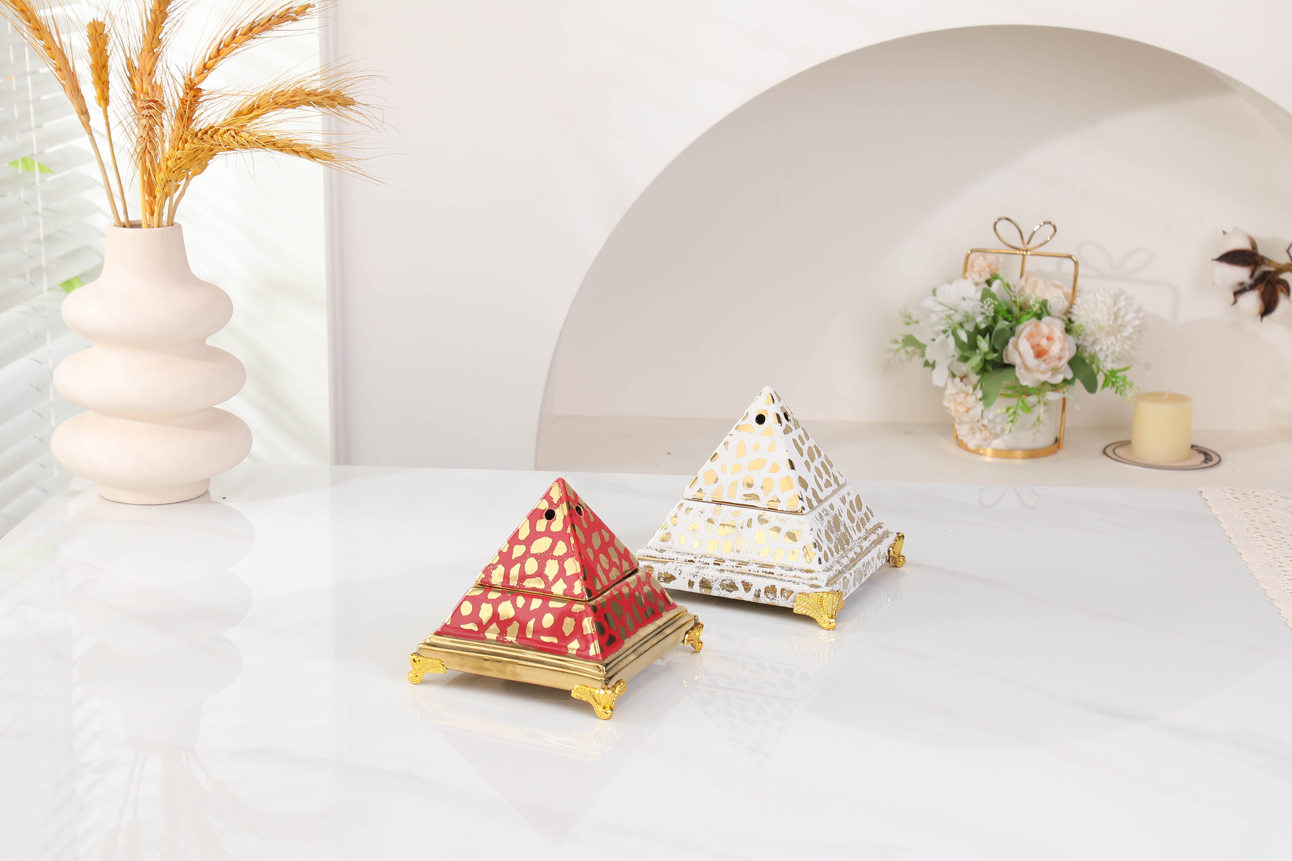 Inspired by the ancient Egyptian pyramids, this design is both decorative and practical. Made of ceramic or metal, it features patterns and gold-painted patterns on the surface, and a gold base with carvings, creating a delicate and beautiful look. The small hole on the top is used to diffuse fragrance, allowing you to place aromatherapy tablets, essential oils, etc. to create a fragrant atmosphere.