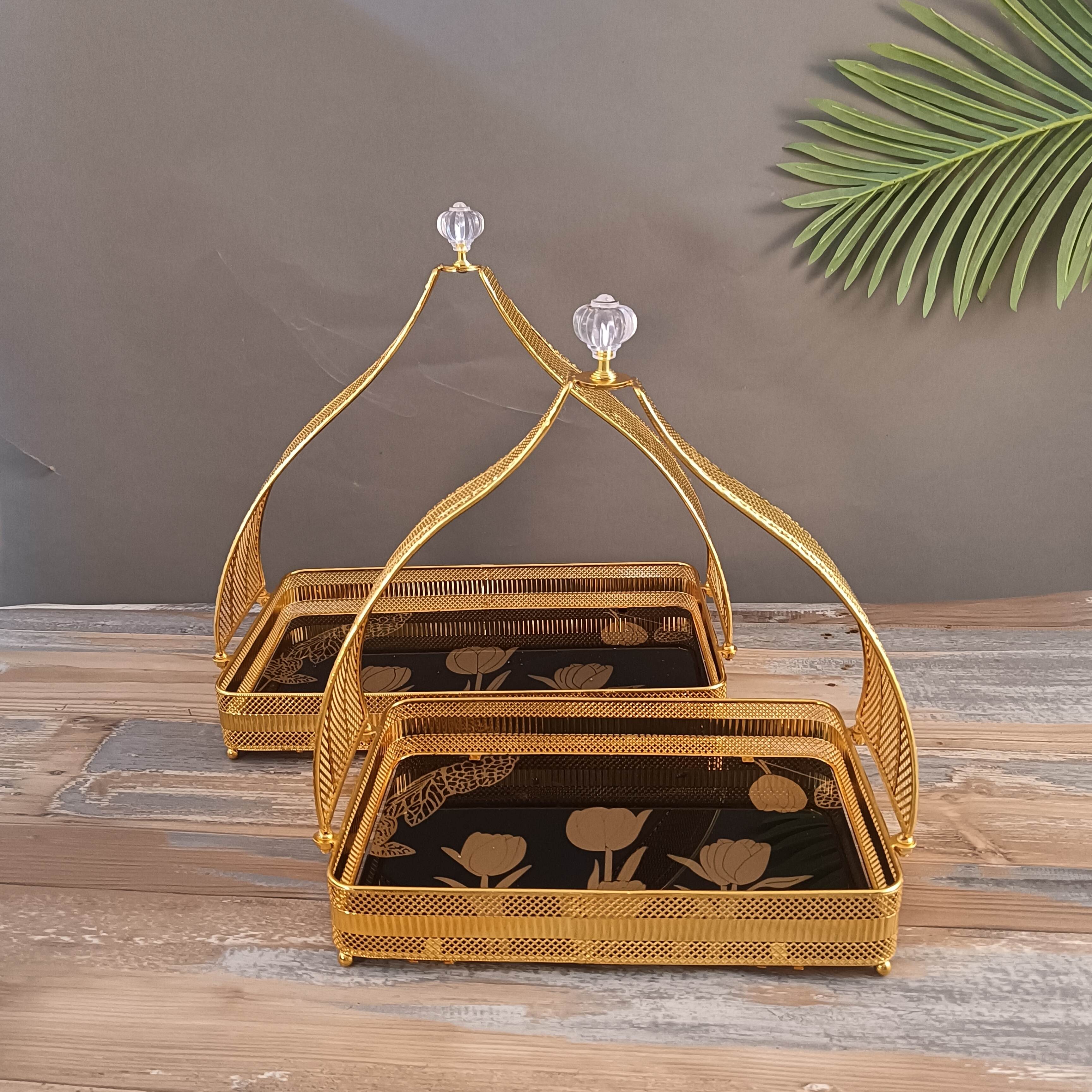 This metal hand basket is crafted from gold metal with a delicate mesh texture and features a transparent decorative element above the handle, adding to its aesthetic appeal. The basket's bottom features a black lining printed with a gold floral pattern. The overall design is exquisite, combining practicality with decorative appeal. It can be used to hold small items and snacks, and is often featured in home decor and party settings, adding an elegant and refined atmosphere to any space.